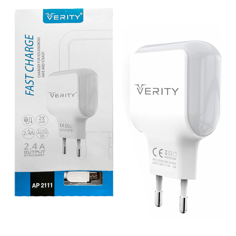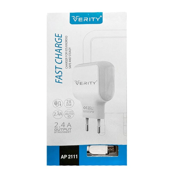 استفاده از شارژر مناسب برای شارژ کردن گوشی موبایل و تبلت باعث افزایش عمر باتری دستگاه شما می شود. شارژر دیواری وریتی مدل AP2111 می تواند انتخاب مناسبی برای شما باشد. این شارژر 2 پورت USB خروجی در اختیار شما می گذارد که می توانید با استفاده از آن گوشی موبایل یا تبلت خود را شارژ کنید. جریان خروجی کل این شارژر 2.4 آمپر است.شارژر دیواری 2 خروجی همراه با کابل که همزمان دو دستگاه را شارژ کنید، نیازی به خرید دو شارژر مجزا نیست.این نمونه از شارژرهای وریتی دارای ابعاد و وزنی مناسب بوده که سبب شده همراهی مناسب در سفرها باشد. مدارهای داخلی این محصول در برابر تغییرات جریان محافظتشدهاند و میتوان همزمان دو دستگاه را به خروجیهای آن متصل و شارژ کرد.در ضمن داخل پک این محصول یک عدد کابل میکرو یو اس بی نیز وجود دارد.