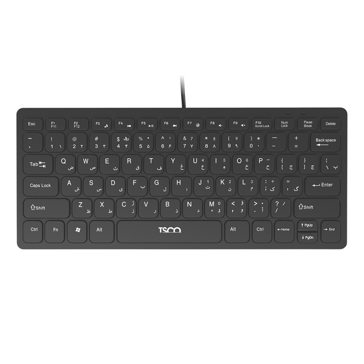 مشخصات ظاهری کیبورد تسکو مدل 8037 کیبورد تسکو مدل TK 8037، ظاهری مینیمال و جمعوجور دارد. این کیبورد، با ابعاد 28.4x12.2x25.5cm و کلاس وزنی 246 گرم، از سری کیبوردهای مینی تسکو محسوب میشود. کیبوردهای مینی دکمههای ماشینحساب سمت راست کیبوردهای معمولی را ندارند. در نتیجه حملونقل و استفاده از آنها بسیار سادهتر است. رنگ مشکی این کیبورد و طراحی ساده و زیبایش، چشم هر بینندهای را نوازش میکند. کیبورد تسکو مدل TK 8037 با کمک یک سیم 1.8 متری و اتصال USB به سیستم شما متصل میشود و اتصالی دقیق و پایدار در اختیارتان قرار میدهد. جالب است بدانید که اتصال سیمی نسبت به اتصال بلوتوث دو مزیت اصلی دارد. مزیت اول اتصال سیمی پایداری بالا و سرعت اتصال عالی است. مزیت دوم نیز عدم نگرانی برای تمامشدن شارژ و باتری و یا هزینههای اضافی برای خرید باتری است. مشخصات فنی کیبورد تسکو مدل 8037 اگر از آن دسته افرادی هستید که ویژگیها و قابلیتهای بیشتر یک کیبورد، توجه و نظرتان را جلب میکند، Tk 8037 حرفهای مهمی برای گفتن به شما دارد. این کیبورد با کلیدهای کارآمد و چندرسانهای، یکی از بهترین گزینههایی است که میتوانید آن را برای میز کار خود انتخاب کنید. اگر خوب به این کیبورد دقت کنید متوجه تعداد دکمههای TK 8037 میشوید. این کیبورد 78 و 7 کلید چندرسانهای دارد. کلیدهای چندرسانهای TK 8037 که از طریق دکمه FN فعال میشوند، امکان دسترسی سریع و یکپارچهای به عملکردهای چندرسانهای در اختیار کاربر قرار میدهند. از دیگر نقاط قوت این کیبورد که میتواند اعتماد کاربران زیادی را به خود جلب کند، پایداری آن است. TK 8037 تا 10 میلیون ضربهپذیری دارد. همچنین این کیبورد سازگاری گستردهای دارد. شما میتوانید این کیبورد را با سیستمعاملهای Windows، Linux، Android، Unix و Mac OS جفت کرده و بهراحتی در هر سیستمعاملی از این کیبورد استفاده کنید. با وجود نمایشگرهای LED این دستگاه، همیشه میتوانید از وضع کلیدهای مهم Num Lock وCaps Lock، مطلع باشید. بهعلاوه کلید fn به شما امکان دسترسی سریع و راحت به پخش و ضبط موسیقی و ویدئو را میدهند.