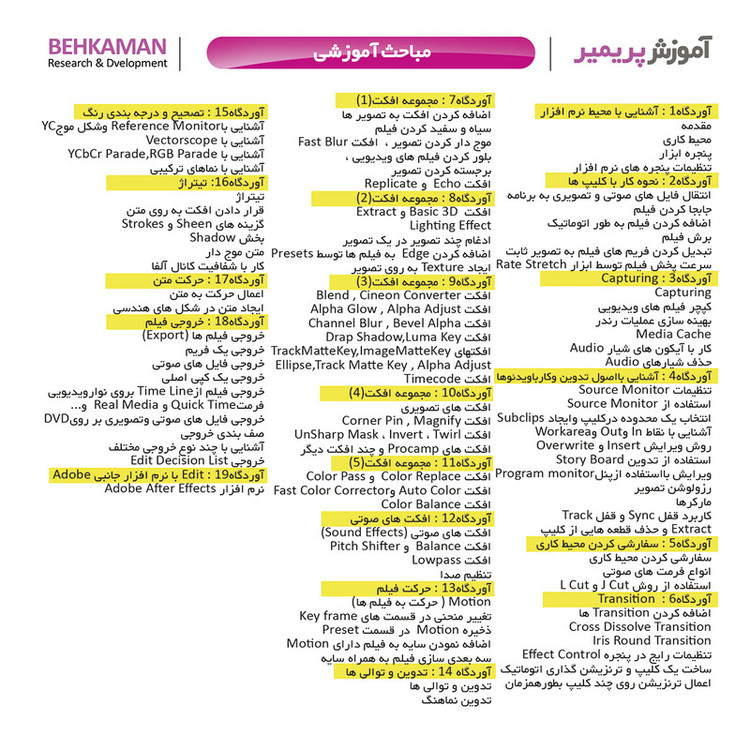 این بسته در 19 فصل و بصورت اینتر اکتیو و حدود 29 ساعت آموزش تهیه شده است . در این بسته شما با محیط نرم افزار و نحوه کار با کلیپ ها و کپچرگیری و اصول تدوین و ترزیشن ها ا انواع افکت ها آشنا می شوید . همچنین با نحوه ساخت تیتراژ وتصحیح رنگ و حرکت فیلم و توالی آن و در نهایت با نحوه گرفتن خروجی آشنا می شوید .