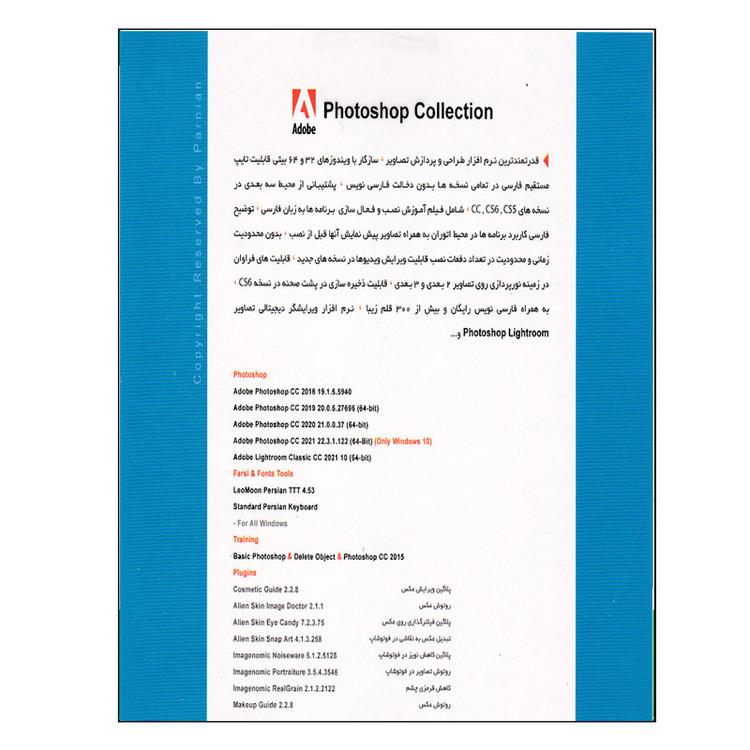 قدرتمندترین نـرم افزار طـراحی و پردازش تصـاویر و سازگار با ویندوزهای 32 و 64 بیتی قابلیت تایپ مستقیم فارسی در تمامی نسخـه هـا بـدون دخـالت فـارسی نویس و پشتیبـانی از محیـط سه بعـدی در نسخه های CC , CS6 , CS5 ، شـامل فـیلم آمـوزش نصـب و فـعـال سازی بـرنامه ها به زبان فارسی می باشد وقابلیت های فراوان در زمینه نورپردازی روی تصاویر 2 بـعدی و 3 بـعدی ، قابلیت ذخیره سازی در پشت صحنه در نسخه CS6 ، به همراه فارسی نویس رایگان و بیش از 300 قلم زیبا و نـرم افزار ویرایشگر دیجیتالی تصاویرPhotoshop Lightroom و... است.