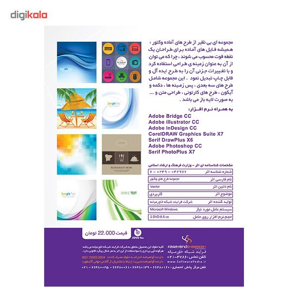 این مجموعه بخش اول «مجموعه طرح های وکتور 1» (Vector 1) است که شامل مجموعهای بینظیر از طرحهای آماده وکتور است. این طرحها و فایلهای آماده همواره برای طراحان یک نقطه قوت محسوب میشوند، چرا که میتوان از آن به عنوان زمینه طراحی استفاده کرد و با تغییرات جزئی آن را به طرح ایدهآل و قابل چاپ تبدیل نمود. این مجموعه شامل طرحهای سه بعدی، پس زمینهها، دکمه و آیکن، طرحهای کارتونی، طراحی متن و ... به صورت لایه باز است. علاوه بر این به همراه این مجموعه، چند نرم افزار نیز آمده است که شامل Adobe Bridge CC , Adobe Illustrator CC , Adobe InDesign CC , CorelDraw Graphics Suite X7 , Serif DrawPlus X6 , Adobe PhotoShop CC , Serif PhotoShop X7 میشود. این محصول حاوی 2 حلقه دی وی دی با حجم 8.5 گیگابایت و قابل نصب بر روی سیستمهای عامل مایکروسافت قابل است. این مجموعه دارای فیلم آموزش فارسی نصب نرم افزار نیز میشود. مجموعه طرحهای وکتور 1 دارای گواهینامه احترام به حقوق مصرف کننده ISO 100002:2004 و دارنده گواهینامه مدیریت ارتباط با مشتریان از آکادمی جهانی آکسفورد است.