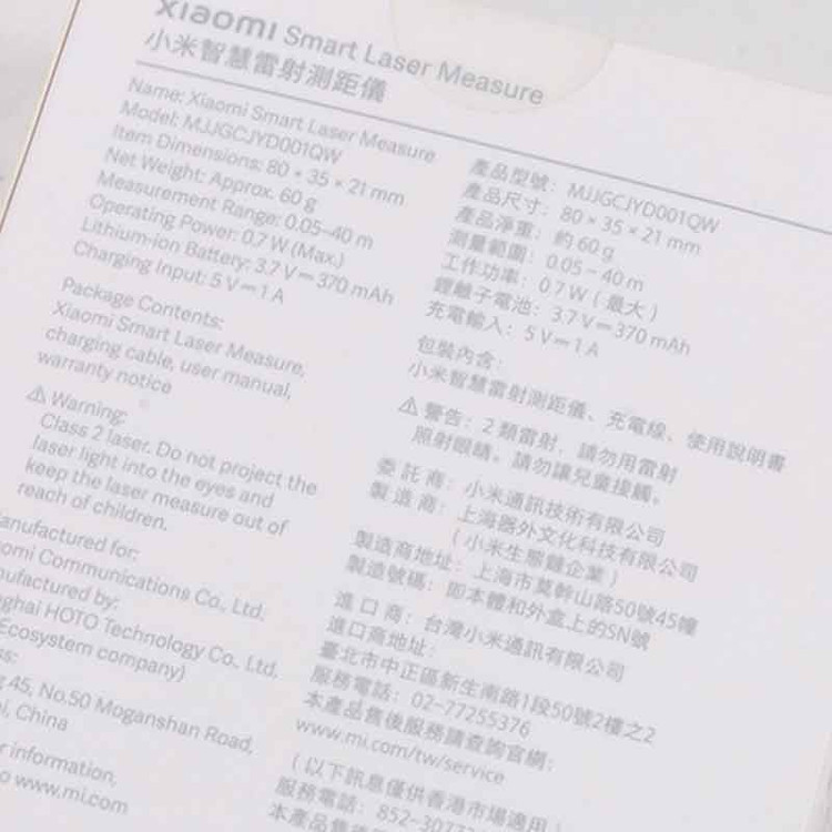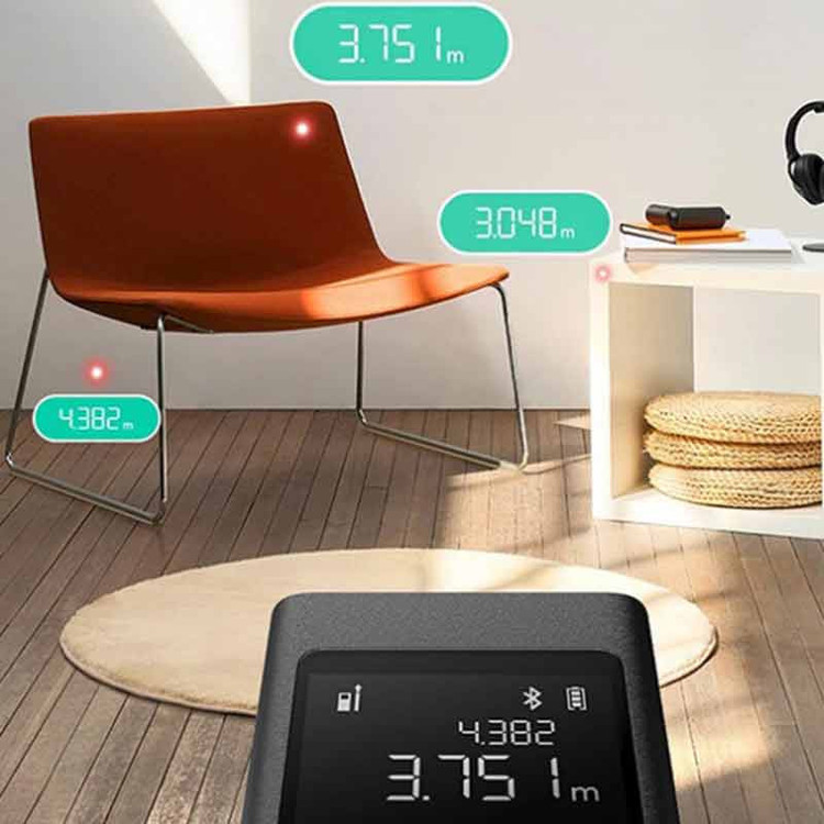 برد اندازه گیری متر لیزری شیائومی مدل MJJGCJYD001QW از 5 سانتی متر تا 40 متر است و دقت اندازه گیری آن 3 میلی متر می باشد. این متر قابلیت اندازه گیری طول، سطح و حجم را داراست. بلوتوث متر تا شعاع 8 متری را در فضاهای آزاد پوشش می دهد. منبع تغذیه متر، باتری لیتیومی 370 میلی آمپر ساعتی است که با کابل Type-C که در پک قرار دارد شارژ می شود. با هر بار شارژ کامل حدود 3 هزار مرتبه می توانید از متر استفاده کنید. اندازه صفحه نمایش LCD 1.23 اینچ است. این نمایشگر وضعیت اتصال بلوتوث، داده های اندازه گیری شده فعالی و داده های ثبت شده قبلی را نشان می دهد. همچنین اطلاعاتی همچون وضعیت باتری، واحد( m/ft) و بسیاری موارد دیگر نیز در این صفحه نمایش قابل مشاهده هستند. دستگاه پس از 180 ثانیه بی استفاده بودن خاموش می شود تا شارژ باتری مدت بیشتری باقی بماند. از دیگر ویژگی های این دستگاه می توان به امکان اتصال آن به اپلیکیشن Mi home اشاره کرد. این امر باعث می شود که امکانات و قابلیت های بیشتری در اختیار شما قرار گیرد. یکی از قابلیت های ارائه شده در این برنامه کاربردی امکان کشیدن پلان طبقاتی در برنامه Mi home است. با کمک این ویژگی علاوه بر تهیه پلان، می توانید عکس واقعی گرفته و سپس از برنامه بخواهید که فواصل بین وسایل موجود در تصویر را اندازه بگیرد. داده های ثبت شده توسط متر لیزری MJJGCJYD001QW به صورت خودکار در محل تعیین شده توسط شما علامت گذاری و نمایش داده می شوند. اندازه متر 8 سانتی متر است که به راحتی در جیب، کیف، داشبورد و ... جا می شود.
