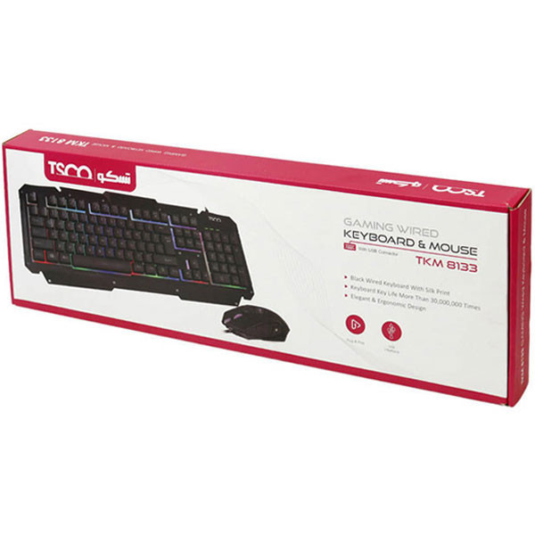کیبورد ماوس گیمینگ تسکو مدل کیبورد TKM 8133GA GAMING نام دارد. کیبورد ماوس گیمینگ تسکو مدل TKM 8133GA با طراحی ارگونومیک برای استفاده طولانی مدت مناسب و یک انتخاب فوق العاده و حرفه ای برای طرفداران بازی های کامپیوتری است. این کیبورد با ابعاد 46x18x2.5CM از طریق کابل USB با طول 1.8 متر به کامپیوتر یا لپ تاپ متصل میشود. در پس زمینه این کیبورد دارای نور رنگی می باشد که جلوه زیبایی به آن می دهد. همچنین کلیدهای با ضربه پذیری بالا استفاده شده در این کیبورد میتواند برای گیمرها بسیار به درد بخور باشد. یکی از جالب ترین ویژگی های کیبورد مخصوص بازی TKM 8133GA دکمه های مولتی مدیای آن است که به شما اجازه کنترل پخش فیلم و موزیک را می دهد و در کنار این امکانات دارای ماوس گیمینگ با ظاهری جذاب برای گیمرها هم می باشد .