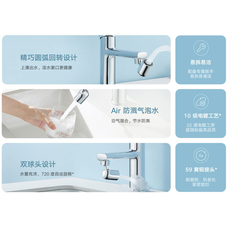 فشار شکن و سرشیر آب Foamer MJSKQPQ01DB S1 میجیا دارای طراحی قوسی اصلاح شده ای است که ستون صافی از آب ایجاد می کند که به آرامی بالا می رود. این محصول همچنین یک سیستم فشار چرخشی دو سر کروی را ادغام می کند، بنابراین فشار آب تحت تاثیر قرار نمی گیرد. در کل امکان چرخش 720 درجه وجود دارد.