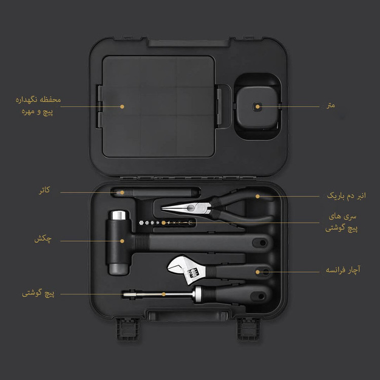 شامل: کیف ابزار , انبردست , آچار فرانسه , پیچ گوشتی , چکش , انبر دم باریک , متر , کاتر