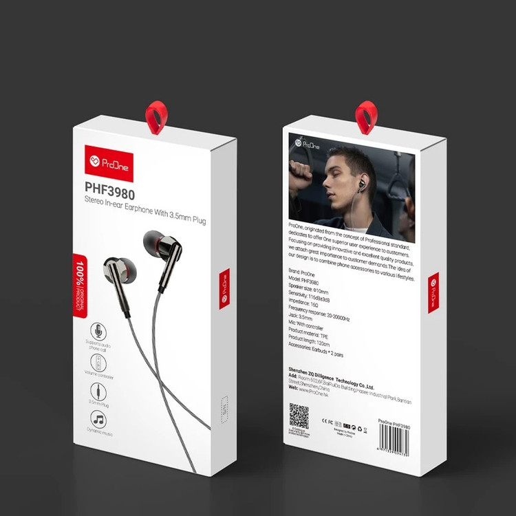 هندزفری مدل «PHF3980» از برندProOne هدفونی مطابق با ارگونومی گوش که میتواند هر کاربر خوشسلیقهای را به خود جذب کند. برای این مدل، یک میکروفون در نظر گرفته شده است تا کاربران قادر به مکالمه با موبایل خود باشند. همچنین یک عدد دکمه برای قطع و وصل کردن صدا در آن تعبیه شده است. با این دکمهها میتوانید به تماسهایتان پاسخ دهید یا مکالمه را قطع کنید. اتصال آن، با یک جک 3.5 میلیمتری انجام میگیرد که باعث میشود با تمام موبایلها و پخشکنندهها سازگار باشد. طول کابل تقریبا 1.2 متر و مناسب برای گوش کردن به موسیقی از موبایل و پخشکنندههای قابل حمل است. PHF3980 بسیار سبک است و کاربر هنگام استفاده، وزن آن را حس نمیکند. امپدانس این محصول 32 اهم است و بهترین کارایی را با دستگاههای مجهز به این امپدانس ارائه میکند.