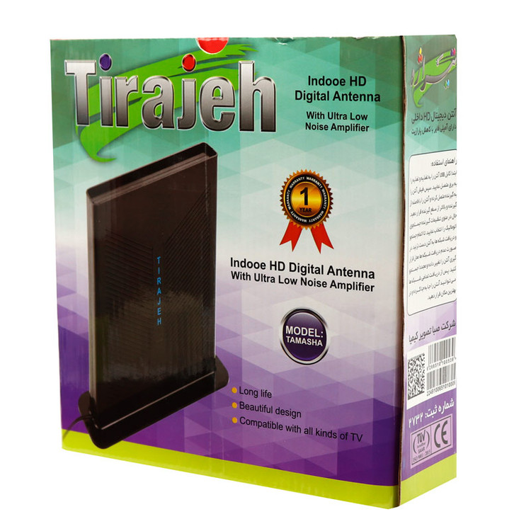 آنتن رومیزی مدل تماشا از برند تیراژه با گیرنده داخلی و تقویت کننده قوی برای دریافت سیگنال کانال های تلویزیونی و استانی دیجیتال و آنالوگ UHF / VHF، بسیار مناسب می باشد. این آنتن با قرارگیری در داخل خانه و کنار تلویزیون، امکان تنظیم آسان و بی دردسر را برای کاربر فراهم می کند و با سیستم کاهش پارازیت می تواند کانال ها را باکیفیت HD در رزولوشن های ۱۰۸۰p ،۱۰۸۰i و ۷۲۰p دریافت کند، اما یک نکته را باید درنظر بگیرید که اگر نزدیک به پنجره گذاشته شود، کیفیت بهتری از سیگنال ها را دریافت خواهید کرد. این آنتن رومیزی تیراژه با انواع تلویزیون سازگاری کامل دارد و با یک خروجی که بر روی آن تعبیه شده به راحتی توسط کابل به تلویزیون متصل می شود. مواد به کار رفته در این آنتن رومیزی HD از پلاستیک سخت می باشد که مقاومت بالایی در برابر ضربه و دیگر آسیب ها خواهد داشت و همچنین با وزن سبکی که به همراه دارد استفاده و جابجایی آن بسیار آسان می باشد.