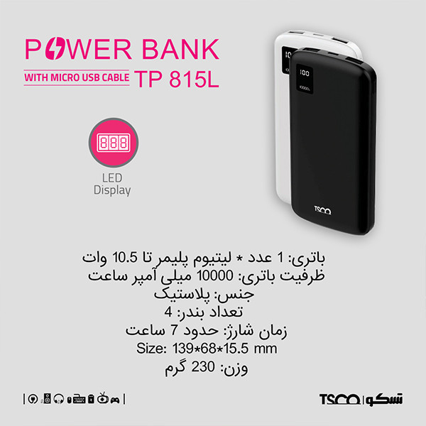پاوربانک تسکو مدل TP 815L حدود 230 گرم وزن دارد و از ولتاژ خروجی 5 ولت و شدت جریان خروجی دارای دو پورت 5V/2.1A است که هر کدام از درگاه ها از آن بهره می برد. دو درگاه تعبیه شده برای این پاوربانک TYPE A , TYPE C، امکان شارژ دستگاه را برای شما فراهم خواهد کرد. این ویژگی مخصوصا در زمان اضطرار بسیار مفید و کاربردی است. گفتنی است که این پاوربانک دارای یک صفحه دیجیتال LED می باشد تا مقدار شارژ دستگاه را به شما نشان دهد. ساختار از جنس پلاستیک این شارژر همراه TP 815L مناسب و وزن نسبتا کم قابلیت حمل آسان را برای شما فراهم آورده است. شما می توانید از پاوربانک 815L به ظرفیت 10000 میلی آمپر ساعت برای شارژ کردن موبایل و تبلت بهره بگیرید و از بابت تمام شدن شارژ دستگاهتان به دلیل ساپورت از PD2.0/3.0&QC 2.0/3.0 به هیچ وجه نگرانی نداشته باشید.