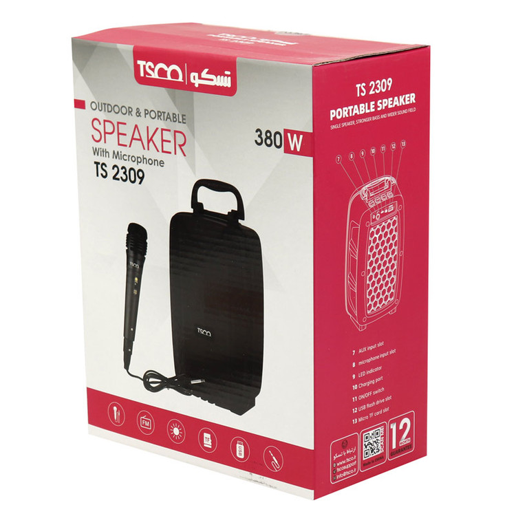 پنلی از دکمه های فیزیکی بر روی بخش بالایی این اسپیکر تعبیه شده که جهت روشن و خاموش کردن، مدیریت پخش موسیقی و ... قابل استفاده می باشند. اسپیکر بی سیم قابل حمل تسکو TS2309 به ورودی میکروفون مجهز شده است که با اتصال میکروفون همراه به این دستگاه، قابلیت کارائوکه فعال شده و عملیات هایی مانند ضبط صدا، تمرین خوانندگی، همخوانی با آهنگ ها و ... جهت لذت و سرگرمی برای کاربر در دسترس خواهد بود. درایو قدرتمند این پخش کننده بلوتوثی پرتابل با توان خروجی ۵ وات قادر است صدایی استریو با وضوح فراگیر را با حساسیت سیگنال به نویز ۷۵ دسی بل در دامنه فرکانسی ۲۰ هرتز تا ۲۰ کیلوهرتز پخش نماید.