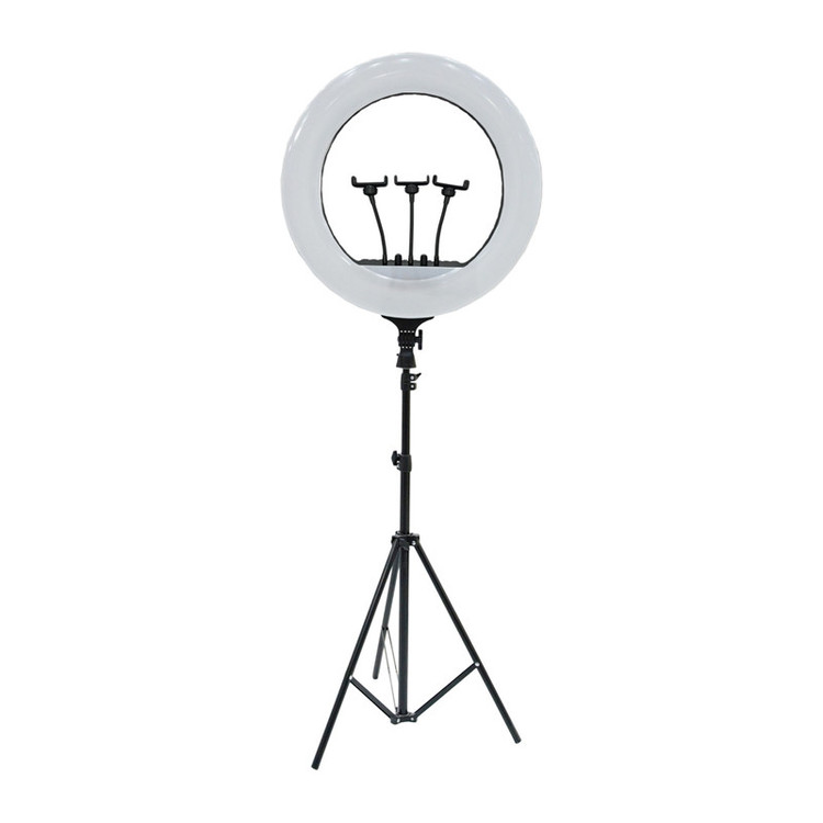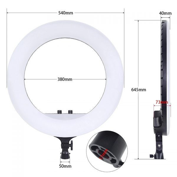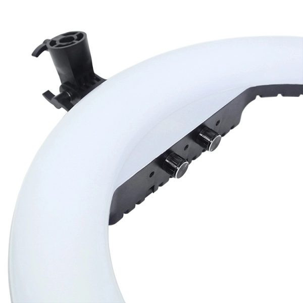 رینگ لایت RL-21 54cm در دسته رینگ لایت های حرفه ای سایز بزرگ می باشد. یکی از مزیت های این رینگ لایت نسبت به سایر رینگ لایت ها دمای نور (کلوین) گسترده تر میباشد. به طوری که بازه نوری این دستگاه از کلوین 2700 تا کلوین 6500 قابل تنظیم بوده و دمای نوری گسترده تر را دراختیار کاربر قرار میدهد. رینگ لایت RL-21 54cm ساخته شده از ABS که مقاومت بالایی نسبت به ضربه دارد و دستگاه رو از ضربات احتمالی و افتادن محافظت می کند. تکنولوژی ساخت : تکنولوژی پیشرفته ساخت لامپ های این دستگاه SMD POWER SAVING میباشد که قدرت نوردهی بالا با مصرف برق کمتر نسبت به سایر مدل ها را به ارمغان اورده است . پشتیبانی از 2 پورت USB در طراحی این دستگاه این امکان را فراهم نموده تا در حین فیلمبرداری های طولانی مدت دیگر نگران شارژ تلفن همراه خود نباشید. رینگ لایت RL-21 54cm دارای 2 دیمر در پنل جلویی دستگاه میباشد که امکان دسترسی به تنظیمات حین فیلمبرداری رو برای کاربر آسان نموده است . وجود ریموت کنترل با برد بیش از 5 متر از دیگر امکانات این دستگاه میباشپ که کنترل دستگاه را از راه دور فراهم می سازد. در طراحی این دستگاه از 3 هولدر موبایل در حلقه داخلی رینگ لایت استفاده شده است . هلدر موبایلی : وجود 3 هولدر این امکان را به شما میدهد که بتوانید به طور همزمان 3 تلفن همراه روی دستگاه نصب کنید و بتوانید هم زمان از 3 شبکه اجتماعی یا 3 پیج مختلف لایو زنده داشته باشید که برای فعالان در حوزه اموزش و سالن های زیبایی و … بسیار کاربردی می باشد. کیف مخصوص : کیف مخصوص حمل رینگ لایت از دیگر متعلقات این دستگاه می باشد . که حمل و نقل آن را آسان نموده است . رینگ لایت RL-21 54cm یک انتخاب خوب و حرفه ای برای سالن های زیبایی ، آتلیه های عکاسی و فعالان در حوزه زیبایی و تولید محتوا می باشد.