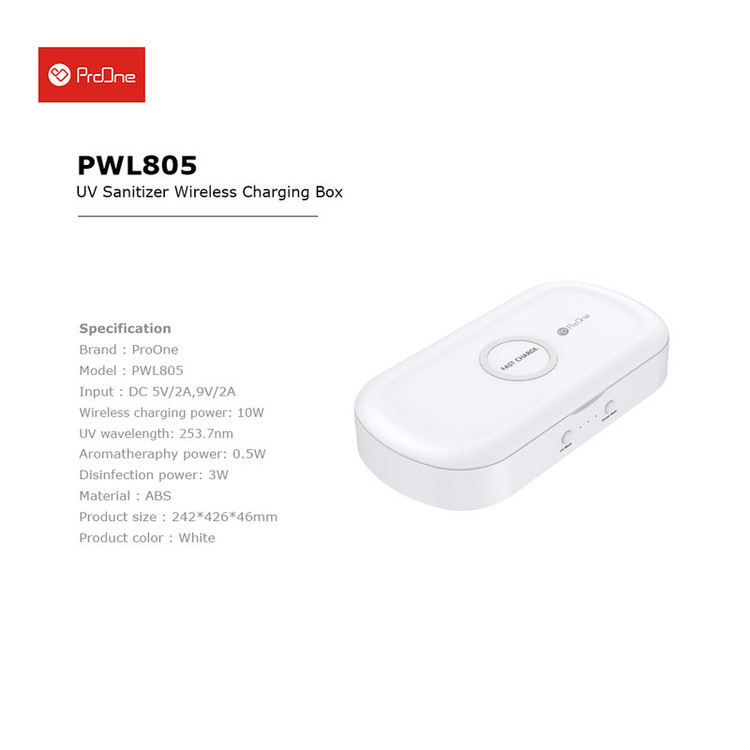 پرووان تصمیم گرفته تا با طراحی شارژر وایرلس و دستگاه ضد عفونی کننده گوشی موبایل مدل PWL805 یک محصول چند منظوره ارائه کند که هم به عنوان ضد عفونی کننده و معطر کننده و هم به عنوان شارژ بی سیم استفاده شود. این استند شارژر دارای قابلیت شارژ تا 10 وات است . با توجه به پشتیبانی شارژر بی سیم پرووان از استاندارد شارژ Qi شما میتوانید هر دستگاهی که از این فناوری پشتیبانی کند را با این شارژر شارژ کنید و با تمام این دستگاه ها سازگار است. این محصول علاوه بر شارژ بی سیم امکان ضد عفونی و معطر کردن اجسام کوچک مثل گوشی ،اپل واچ،ایرپاد را نیز دارد.