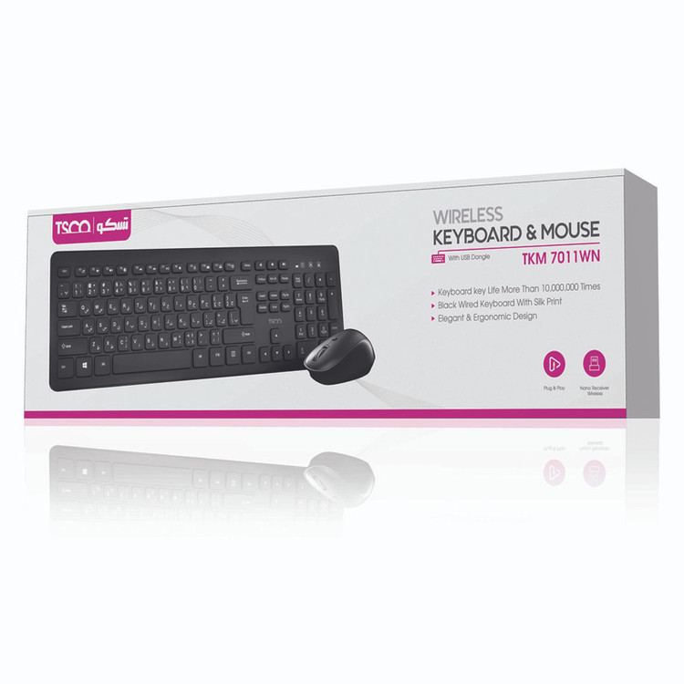 کیبورد TKM 7011WN با اتصال بیسیم نوع 2.4G، و فرکانس در بازه 2402MHz تا 2480MHz ، ارتباطی پایدار و بینقص و پایدار در اختیار شما قرار میدهد. این کیبورد با 108 کلید اصلی و 12 کلید میانبر مالتی مدیا تمام نیازهای شما هنگام کار و یا بازی را برآورده میکند. بهعلاوه با دارابودن چراغ مخصوص روشن و خاموش بودن دکمههای Num Lock/Caps Lock، بهراحتی میتوانید وضعیت روشن و خاموش بودن کلیدهای میانبر را دریابید. رنگ مشکی، طراحی باریک و سبک این کیبورد در ابعاد 45.5 × 14 × 3.2 سانتیمتر و کلاس وزنی 467 گرم امکان حملونقل آسان و استفاده در هر زمان و هر مکانی را فراهم میکند. این کیبورد به همراه یک باطری نوع AA ارائه میشود که عمر طولانی و عملکرد قابلاعتمادی دارد. مشخصات فنی و ظاهری ماوس تسکو مدل TKM 7011WN ماوس این ست نیز عملکرد بینقصی ارائه میکند. با ابعاد 10x6x4 سانتیمتر و اندازه 55.5 گرم، ماوس بیسیم TKM 7011WNقابلیت اتصال تا فاصله 10 متر، آزادی عمل زیادی به شما میدهد. همچنین بادقت بالا و قابلتنظیم بین مقادیر 800-1200-1600، تجربهٔ کار بادقت و صحیح را تجربه کنید. این ماوس با 4 کلید اصلی کنترل میشود و به همراه آن یک باتری نوع AAA برای استفاده از ماوس ارائه میشود.