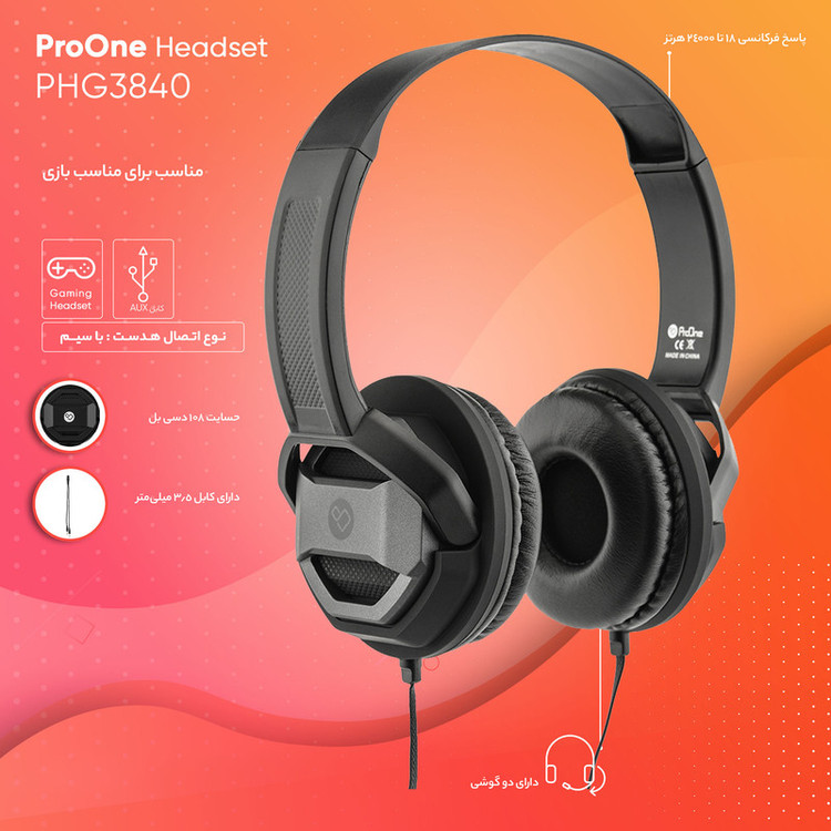هدست پرووان مدل PHG3840، یک محصول کاربردی و خوش ساخت با طراحی ارگونومیک و متریال باکیفیت است که به صورت با سیم توسط رابط جک 3٫5 میلیمتری صدا (AUX) به کنسولهای بازی، گوشیهای موبایل، کامپیوتر و دیگر دستگاههای سازگار متصل میشود. بالشتکهای آن با جنسی از چرم مصنوعی، تمام سطح گوش را پوشش میدهند و در استفاده طولانی مدت باعث خستگی کاربر نخواهند شد. تل هدفون نیز از انعطاف پذیری و قابلیت تنظیم ارتفاع برخوردار است تا مناسبترین حالت و زاویه قرارگیری روی سر برای استفاده بهتر را انتخاب کنید. برند ProOne در ساخت این هدفون از مواد مرغوب و مقاومی بهره برده که در برابر فشار و ضربه استحکام کافی را از خود نشان میدهد. صدای قدرتمند این هدفون با وجود دامنه پاسخگویی با رنج داینامیک 18 هرتز تا 24 کیلو هرتز، حساسیت سیگنال به نویز 108 دسی بل و امپدانس 32 اهم، طیف وسیعی از صداهای زیر و بم از هر سبک موسیقی را با وضوح بالا و استریو، بیس قوی و بدون تاخیر به گوش میرساند که نیاز دوستداران بازی، گوش دادن به موسیقی و تماشای فیلم را برطرف خواهد کرد. میکروفون هدست ProOne PHG3840 به صورت داخلی طراحی شده و قابلیت مکالمه تماس را دارد. طول کابل این هدست 120 سانتیمتر است.