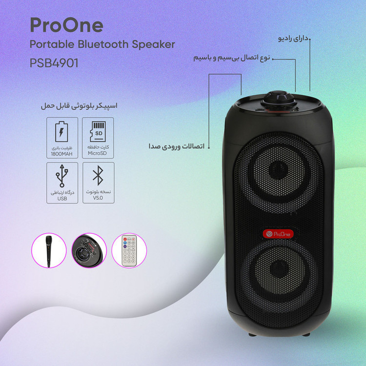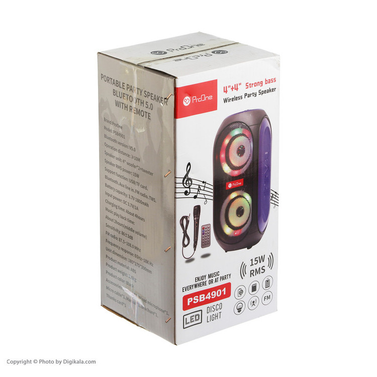 اسپیکر پرووان PSB4901 ازتولیدات اخیر شرکت پرووان در زمینه اسپیکرهای بیسیم است. اسپیکر پرووان PSB4901 از یک باتری 1800 میلی آمپر بهره میبرد. باتری این اسپیکر از نوع لیتیم پلیمر قابل تعویض است. این اسپیکر دو باند 4 اینچی دارد که با توان خروجی 15 وات میتواند به مدت 2 ساعت برای شما پخش موسیقی انجام دهد. اسپیکر پرووان PSB4901 از قابلیت TWS پشتیبانی میکند. شما با استفاده از این فناوری میتوانید دو اسپیکر با مدلهای یکسان را به یکدیگر متصل کرده و به صورت هم زمان از آنها استفاده کنید. بلوتوث این اسپیکر نسخه 5 است که میتوانید از آن برای متصل شدن دستگاهتان استفاده کنید و تا برد 10 از آن استفاده کنید نگران قطع شدن اتصال نباشید. شارژ اسپیکر پرووان PSB4901 از طریق کابل Micro USB انجام میشود و طی مدت زمان 4 ساعت از صفر تا صد شارژ میشود. اسپیکر پرووان PSB4901 در ابعادی معادل طول 185، عرض 175 و ارتفاع 390 میلی متر تولید شده است. این اسپیکر وزنی معادل 2 کیلوگرم دارد که به راحتی میتوانید آن را حمل کنید. یک نمایشگر روی اسپیکر تعبیه شده است که با استفاده از آن میتوانید اطلاعات پخش دستگاه و یا موسیقی مورد نظرتان را مشاهده کنید. از دیگر ویژگیهای این اسپیکر میتوان به وجود ورودی برای میکروفون اشاره کرد یعنی هم زمان میتوانید از میکروفون هم استفاده کنید. از بخشهای جذاب و منحصر به فرد اسپیکر پرووان PSB4901 میتوان به رقص نور و روشنایی آن اشاره کرد که دارای LED های رنگی می باشد.در قسمت داخلی اسپیکر PSB4901 نواری از نورهای LED وحود دارند که به زیبایی محصول میافزایند. هم چنین در قسمت بالایی اسپیکر محفظه برای کارت micro sd وجود دارد. شما میتوانید از طریق ورودی کابل AUX نیز نسبت به وصل کردن دستگاهتان و پخش موسیقی مد نظرتان اقدام کنید. اسپیکر پرووان PSB4901 در رنگ مشکی تولید و به بازار ارائه شده است. از اقلام همراه این کالا میتوان به یک میکروفون سیم دار ، ریموت کنترل و یک سیم میکرو جهت شارژ اسپیکر اشاره کرد.
