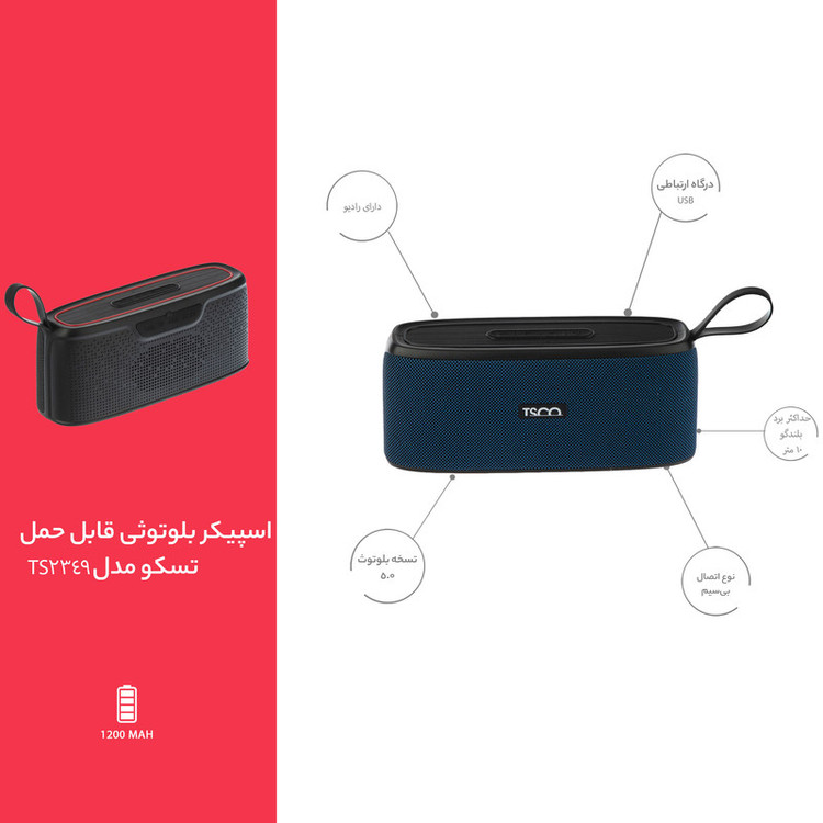 اسپیکر بلوتوثی قابل حمل تسکو مدل TS 2349 محصولی از شرکت نام آشنای «تسکو» است که به ابعاد و وزن آن به گونهای است که به راحتی میتوانید آن را جابجا کنید و همه جا همراه داشته باشید. اسپیکر TS 2349 بهصورت بیسیم از طریق فناوری بلوتوث به تلفن همراه متصل میشود. نسخهی بلوتوث پشتیبانیشده در این محصول 5.0 است. علاوهبر بلوتوث میتوانید از طریق جک 3.5میلیمتری صدا گوشی یا دستگاه خود را به ورودی USB این محصول متصل کنید. تسکو برای این کار یک کابل تبدیل 3.5 میلیمتری و یک کابل تبدیل microUSB به USB را در جعبه این اسپیکر قرار داده است. بهرهبردن از جک 3.5میلیمتری صدا باعث شده که کاربر بدون درگیرشدن با تنظیمات گوشی خود و تنها با اتصال کابل بتواند اقدام به پخشموسیقی کند. در صورتیکه میخواهید از این محصول بدون نیاز به پخشکنندهی صوتی استفاده کنید، شرکت تسکو این محصول را به یک درگاه USB و شیار کارت حافظه تجهیز کرده است. توان خروجی این اسپیکر شرکت تسکو برابر با 4.6 وات است که مقدار مناسبی برای یک اسپیکر به شمار میرود. این اسپیکر طراحی زیبایی دارد و به راحتی میتوانید آن را بر روی میز قرار داده و از قابلیتهای متعددش بهره ببرید.