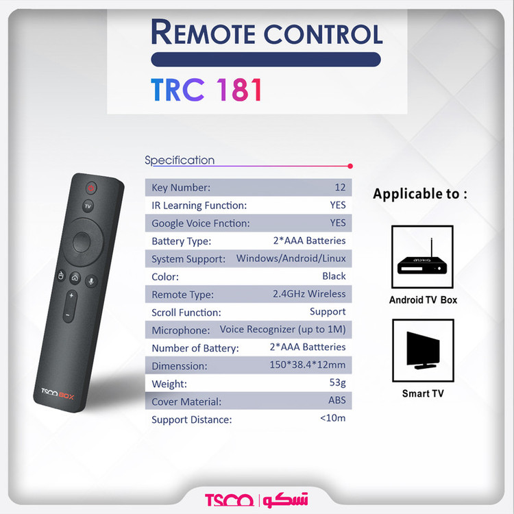 ریموت کنترلر ایرموس TRC181 محصول جدیدی از شرکت تسکو TSCO است. این محصول از 4 کاربرد ریموت کنترل، مینی کیبورد، تاچ پد (جهت اسکرول) و ایرموس بهره میبرد که برای استفاده در انواع تلویزیون های هوشمند، اندروید باکس ها، پروژکتورها و همچنین سیستم عامل های ویندوز، اندروید، لینوکس و مک مناسب است. این کنترل دارای بدنه ای از جنس پلاستیک ABS و بوده و کیفیتی مناسب دارد. به لطف طراحی ارگونومیک به راحتی در دستان شما جای میگیرد. اتصال ریموت هوشمند TRC181 به سایر دستگاه ها با برد 10 متر و فرکانس 2٫4 گیگاهرتز انجام میگیرد. در یک طرف این دستگاه کلید های جستجوگر صوتی، کلیدهای مجزا جهت نما، ولوم صدا و… تعبیه شده و در سمت دیگر کیبورد و تاچ پد (جهت اسکرول) قرار دارد. این کیبورد دارای 12 کلید است.این کنترل به وسیله دو عدد باتری قلمی AAA انرژی خود را به دست میآورد.