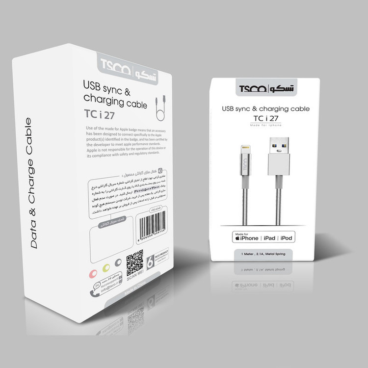 کابل «تسکو» مدل «TC i27» دارای روکش بافته شده است. این نوع روکش باعث میشود که کابل در برابر گره خوردن مقاومت مطلوبی داشته باشد و به دور وسایل دیگر کیف یا در خود پیچیده نشود. علاوه براین، استفاده از این روکش باعث دوام بالای کابل میشود. این کابل شرکت تسکو برای شارژ و انتقال اطلاعات مناسب است. در یک طرف از این کابل یک متری کانکتور USB و در طرف دیگر کانکتور لایتنینگ وجود دارد و آن را برای محصولات شرکت اپل مانند دستگاههای بلوتوثی مانند هدفونهای بیسیم و با تبلتها و گوشیهای موبایل مجهز به درگاه لایتنینگ مناسب میسازد. برای استفاده از این محصول کافی است کانکتور USB آن را به شارژر یا پورت USB لپتاپ یا کامپیوتر متصل کنید و دیگر کانکتور آن را به پورت لایتنینگ گوشی موبایل، تبلت یا دیگر دستگاه دیجیتالی وصل کنید. گفتنی است این محصول در طول 100 سانتیمتر به بازار عرضه شده است.