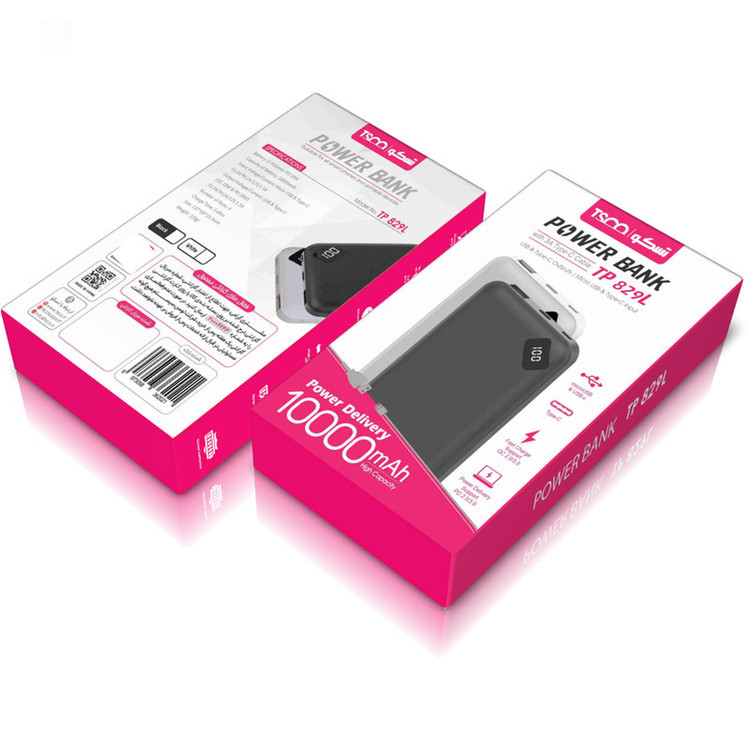 پاوربانک تسکو مدل TP 829 حدود 220 گرم وزن دارد و از ولتاژ خروجی 5 ولت و شدت جریان خروجی 18 وات PD بهره می برد. دو درگاه تعبیه شده برای این پاوربانک TYPE A , TYPE C، امکان شارژ همزمان دو دستگاه را برای شما فراهم خواهد کرد. این ویژگی مخصوصا در زمان اضطرار بسیار مفید و کاربردی است. گفتنی است که طراحی مناسب و وزن نسبتا کم TP 829 قابلیت حمل آسان را برای شما فراهم آورده است. شما می توانید از پاوربانک تسکو مدل TP 829 به ظرفیت 10000 میلی آمپر ساعت برای شارژ کردن موبایل و تبلت بهره بگیرید و از بابت تمام شدن شارژ دستگاهتان به دلیل ساپورت از PD2.0/3.0&QC 2.0/3.0 به هیچ وجه نگرانی نداشته باشید.