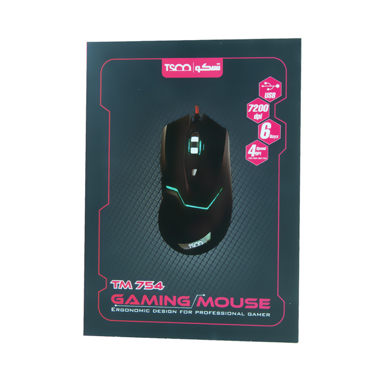 ماوس مخصوص بازی تسکو TM 754 از دسته محصولاتی است که کمپانی تسکو مخصوص گیمرها تولید و به بازار عرضه کرده است. این ماوس کیفیت ساخت بسیار بالایی دارد. علاوه بر آن کار با آن به دلیل طراحی خوبی که دارد، بسیار راحت و دوستداشتنی خواهد بود. سنسورهای این ماوس دقتی برابر 3200 DPI دارد و به همین دلیل برای بازی کردن بسیار مناسب است. این مساله میتواند به از بین رفتن باگ و قطعیها در زمان انجام بازی کمک کند و آنها را به حداقل ممکن برساند. ماوس تسکو مدل TM 754 ظاهری زیبا و شکیلی و ابعادی برابر با 131×70×42.4 میلیمتر دارد و وزن آن 140 گرم است. این ماوس دارای 6 کلید است و در بدنه آن چراغهای الایدی بهکار رفته است. علاوه بر آن این موس سیمی به طول 1.8 متر دارد که از طریق رابط USB به سیستم کامپیوتر متصل میشود. ماوس تسکو TM 754با سیستمهای عامل ویندوز، مک، لینوکس و اندروید سازگار است.