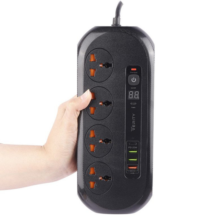 چند راهی برق حرفهای وریتی مدل V-PS3115 دارای 4 پریز برق اروپایی دارای سطح ایمنی محافظ کودک و سه عدد پورت usb و یک عدد پورت تایپ سی برای شارژ انواع گوشیهای هوشمند تبلتها اسپیکرها و … ، دارای کلید روشن و خاموش و نمایشگر LED میباشد. کابل برق این محصول داری طول 180 سانتیمتر و روکش مقاوم TPE میباشد این محصول دارای بدنه مقاوم از جنس پلاستیک در برابر حرارت تا 750 درجه سانتیگراد و آسیبهای فیزیکی احتمالی همچون ضربه فشار میباشد و دارای توان و جریان نامی 10 آمپر و 3000 وات می باشد شارژر تایپ سی این محصول 20 وات و دارای فناوری پیدی میباشد و همچنین پورت usb شارژ سریع می باشد چند راهی برق و شارژر وریتی مدل V-PS3115 دارای تایمر خاموشی قابل تنظیم از 1 تا 24 ساعت میباشد که این ویژگی برای مواقع زیادی کاربرد خواهد داشت.