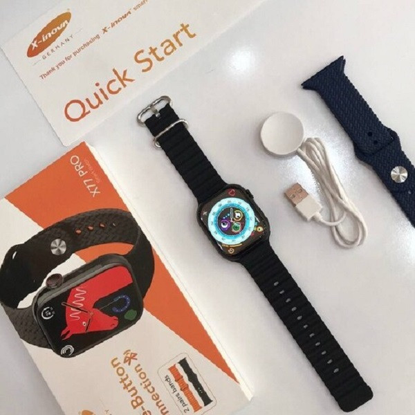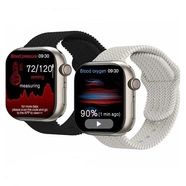 دو نوع بند سیلیکونی با رنگ مختلف در جعبه ساعت هوشمند مدل X77 Pro قرار دارد. یک بند سیلیکونی با طرح حصیری، و دیگری با طرح اوشن که یکی از معروف ترین بندهای اپل واچ است.