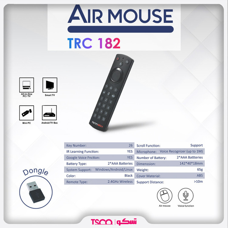 ریموت کنترلر ایرموس TRC182 محصول جدیدی از شرکت تسکو TSCO است. این محصول از چند کاربرد ریموت کنترل، مینی کیبورد، تاچ پد (جهت اسکرول) و ایرموس بهره میبرد که برای استفاده در انواع تلویزیون های هوشمند، اندروید باکس ها، پروژکتورها و همچنین سیستم عامل های ویندوز، اندروید، لینوکس و مک مناسب است. این کنترل دارای بدنهای از جنس پلاستیک ABS و بوده و کیفیتی مناسب دارد. به لطف طراحی ارگونومیک به راحتی در دستان شما جای میگیرد. اتصال ریموت هوشمند TRC182 به سایر دستگاه ها با برد 10 متر و فرکانس 2٫4 گیگاهرتز انجام میگیرد. در یک طرف این دستگاه کلید های جستجوگر صوتی، کلیدهای مجزا جهت نما، ولوم صدا و… تعبیه شده و در سمت دیگر کیبورد و تاچ پد (جهت اسکرول) قرار دارد. این کیبورد دارای 26 کلید است.این کنترل به وسیله دو عدد باتری قلمی AAA انرژی خود را به دست میآورد.