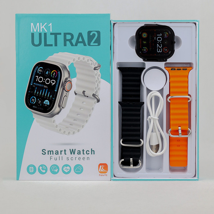 ساعت هوشمند مدل MK1 ULTRA2 یک ساعت هوشمند و مدرن است که به شما امکان میدهد با تمام ویژگیهای جذابش به راحتی در محل کار، ورزش و حتی مواقع رسمی، خوش تیپ و شیک باشید.این ساعت هوشمند دارای قابلیتهای فراوانی است. با قابلیت مکالمه (از طریق اتصال به بلوتوث) و پخش موسیقی، شما میتوانید از تماس با دوستان و موسیقیهای مورد علاقهتان لذت ببرید. اما قابلیت برجستهتر این ساعت هوشمند، سنسورهای سلامتی فراوانی است که دارد. با پایش ضربان قلب، فشار خون، اکسیژن خون و…، این ساعت به شما کمک میکند تا سلامتی خود را بررسی کرده اما لطفاً توجه داشته باشید که این ساعت به هیچوجه، یک وسیله پزشکی نیست و تمامی دادههای مربوط به پایش سلامت، صرفاً به منظور اطلاع کلی شماست.ساعت هوشمند MK1 ULTRA2 دارای 2 عدد بند سلیکونی قابل تعویض داخل جعبه میباشد. شارژر داخل جعبۀ ساعت از نوع وایرلس و مگنتی است. چنانچه گفته شد، بند این مدل، قابل تعویض با تمام بندهای اپل واچ میباشد.از امکانات دیگر این ساعت میتوان به منوی بسیار روان و سریع به همراه سخت افزار قوی و پشتیبانی از زبان فارسی اشاره کرد.