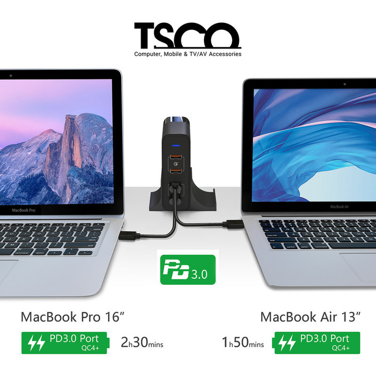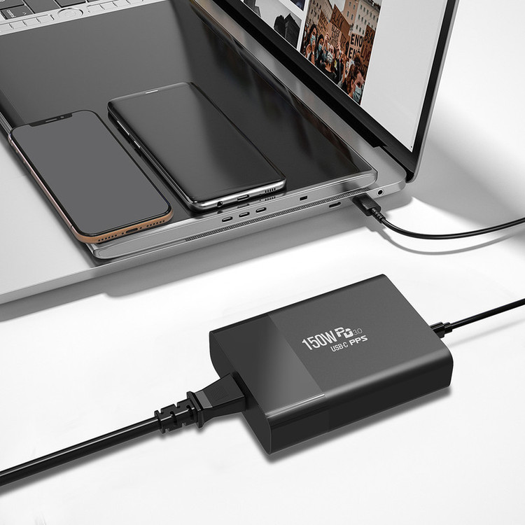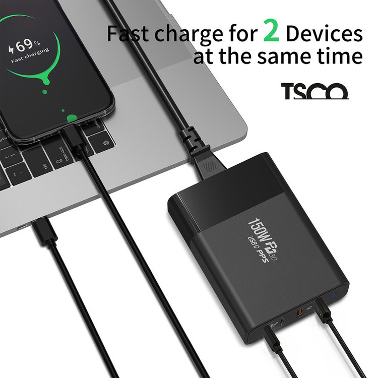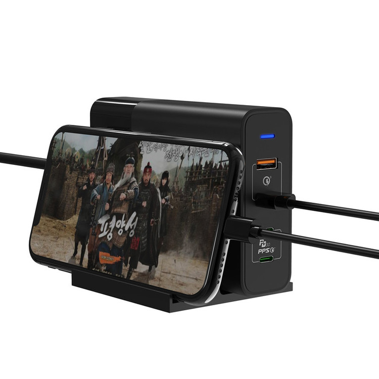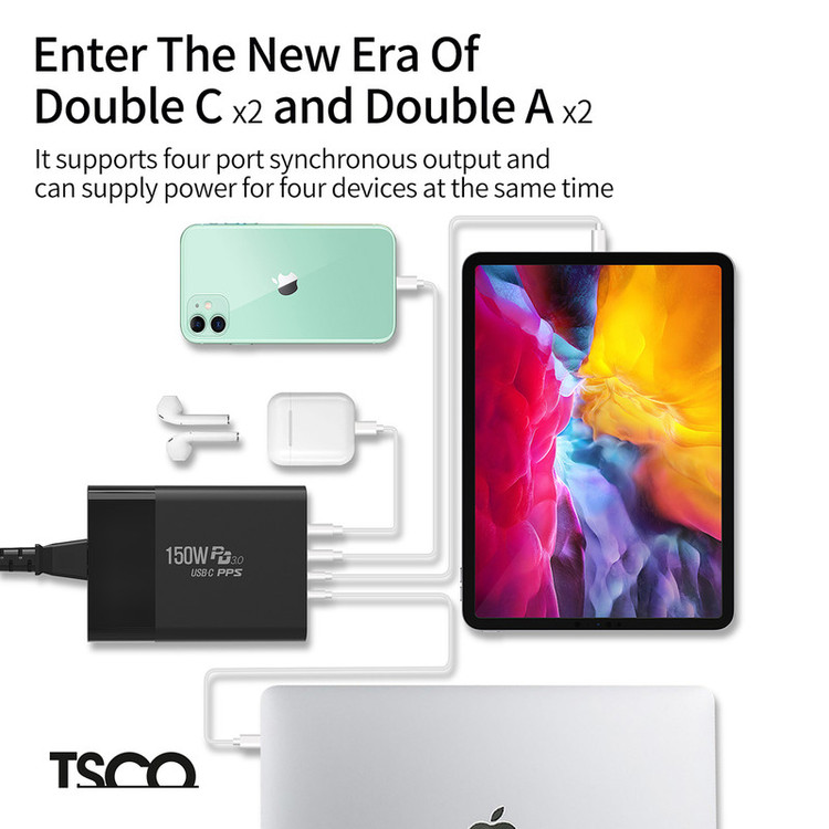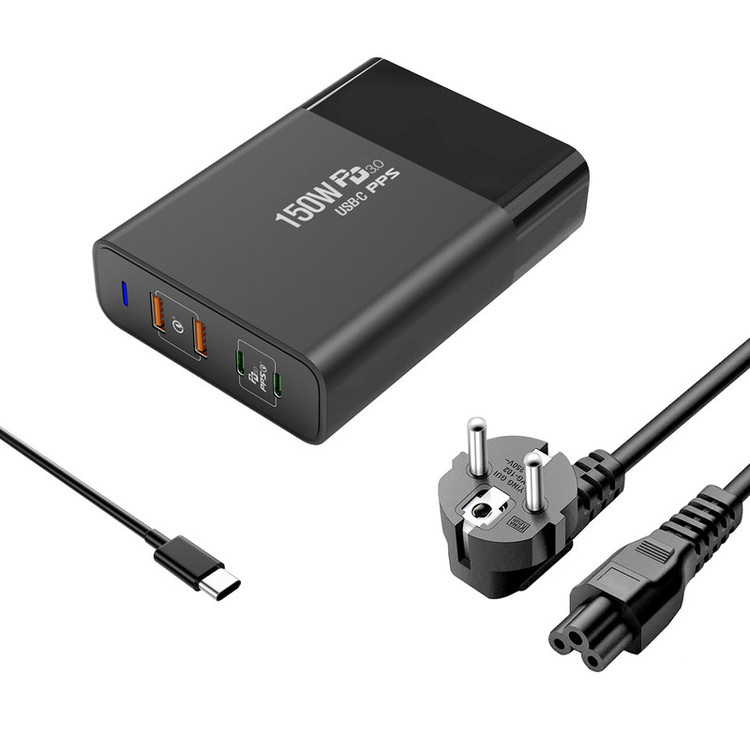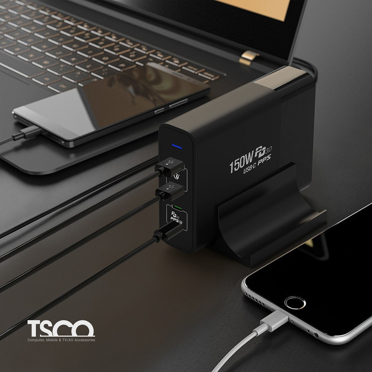 قابل استفاده بر روی میز ,قابلیت شارژ دستگاه تا حداکثر 150 وات ,قابلیت شارژ 4 دستگاه به طور همزمان ,قابلیت شارژ لپ تاپ , Total Output : 150 w, 2 USB A+ 2 USB C, همراه استند نگهدارنده