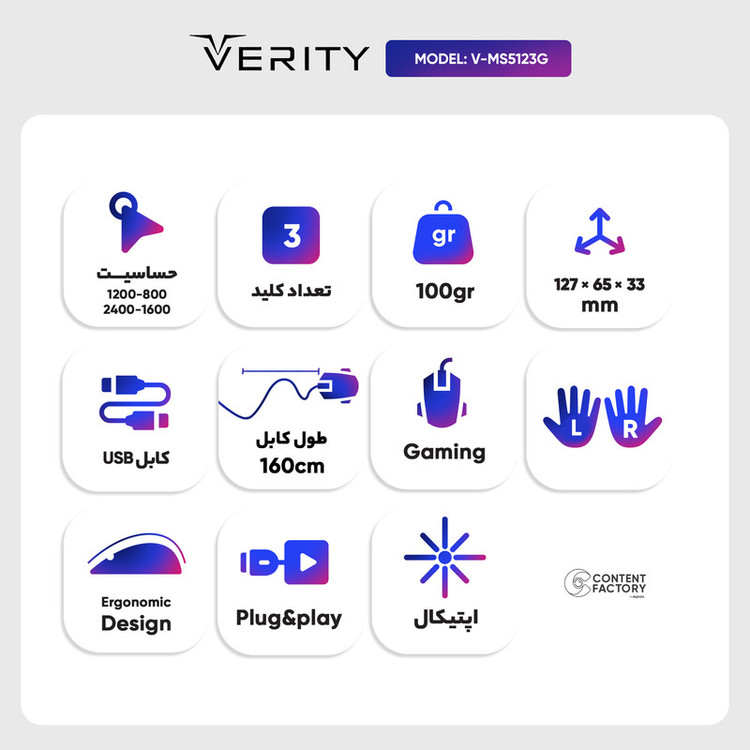 ماوس گیمینگ سیمی RGB وریتی مدل V-MS5123G یک محصول جدید از کمپانی وریتی است که به تولید محصولات گیمینگ متخصص است. این ماوسهای گیمینگ با تاخیر پایین، اتصال پایدار و کیفیت ساخت بالا، انتخاب عالی برای مشتریان علاقهمند به بازیهای ویدیویی است. ماوس وریتی مدل V-MS5123G یک ماوس بیسیم است که برای اتصال به کامپیوتر یا دستگاههای دیگر از فناوری بلوتوث استفاده میکند. این نوع اتصال به کاربر امکان میدهد تا بدون نیاز به کابل، از ماوس خود استفاده کند و به راحتی حرکت کند. این ماوس دارای ورودی Micro-USB است که میتوان از آن برای شارژ با استفاده از آداپتور یا حتی اتصال به کامپیوتر استفاده کرد. این ویژگی امکان شارژ سریع و آسان را به کاربر میدهد. این ماوس برای افرادی که دست بزرگ دارند مناسب است. با طراحی ارگونومیک و ابعاد بزرگتر، این ماوس به راحتی در دستان بزرگ قرار میگیرد و امکان استفاده راحت و بدون مشکل ارائه میدهد. دکمه DPI در این ماوس به صورت قابل تنظیم است. با استفاده از نرمافزار مربوطه که به همراه ماوس ارائه میشود، کاربران میتوانند دقت ماوس خود را با تغییر دادن مقدار DPI به دلخواه تنظیم کنند. این قابلیت به بازیکنان امکان انطباق دقت حرکات ماوس با نیازهای بازیهای مختلف را میدهد. نور RGB در ماوس وریتی مدل V-MS5123G قابل تنظیم است. این ماوس دارای نورپردازی RGB با قابلیت تغییر رنگ و حالتهای مختلف است که میتوانید آنها را از طریق نرمافزار مربوطه تنظیم کنید. در صورتی که نمیخواهید از نورپردازی RGB استفاده کنید، میتوانید آن را بهصورت کامل خاموش کنید.