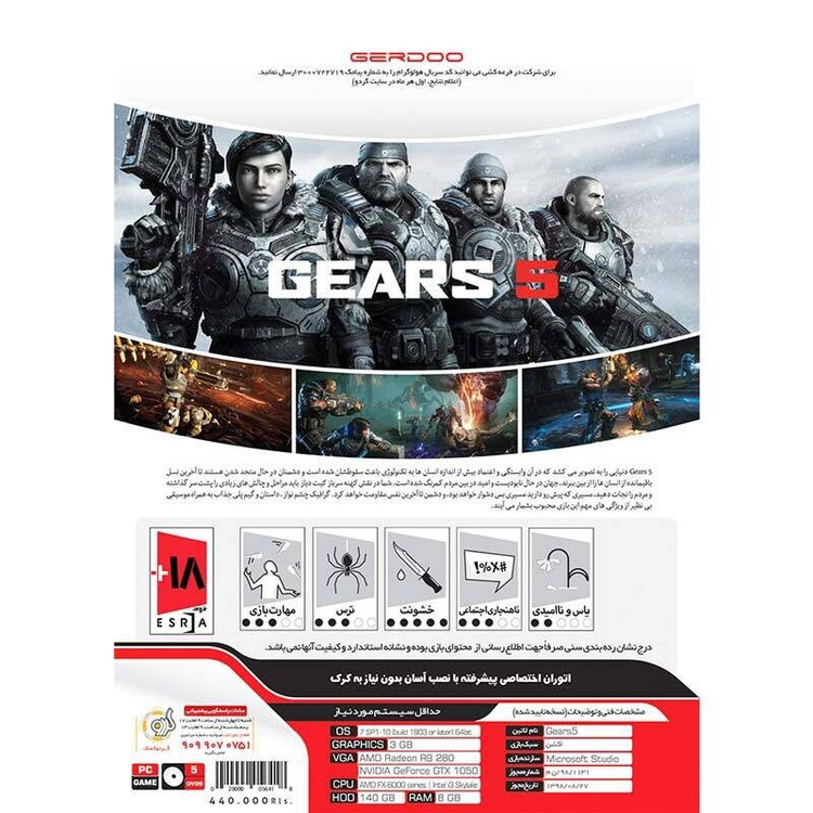 Gears 5 دنیایی را به تصویر می کشد که در آن وابستگی و اعنماد بیش از اندازه انسان ها به تکنولوژی باعث سقوطشان شده است و دشمنان در حال متحد شدن هستند تا آخرین نسل باقیمانده از انسان ها را از بین ببرند، جهان در حال نابودیست و امید در بین مردم کمرنگ شده است. شما در نقش کهنه سرباز کیت دیاز باید مراحل و چالش های زیادی را پشت سر گذاشته و مردم را نجات دهید، مسیری که پیش رو دارید مسیری بس دشوار خواهد بود، و دشمن تا آخرین نفس مقاومت خواهد کرد.گرافیک چشم نواز ، داستان و گیم پلی جذاب به همراه موسیقی بی نظیر از ویژگی های مهم این بازی محبوب بشمار می آیند. سازگار با: کامپیوتر و لپتاپ ژانر: اکشن تعداد دیسک: پنج حلقه DVD9 سیستم عامل مورد نیاز: Win 7 / Win 8 / Win 10 پردازنده مورد نیاز: Intel Corei 3 _ AMD FX 6000 رم مورد نیاز: 8GB گرافیک مورد نیاز: 3 GB NVIDIA GeForce GTX 1050 AMD Radeon R9 280 فضای مورد نیاز: 140GB در مورد محصول هر سوالی داشتید میتونید از ما بپرسید.