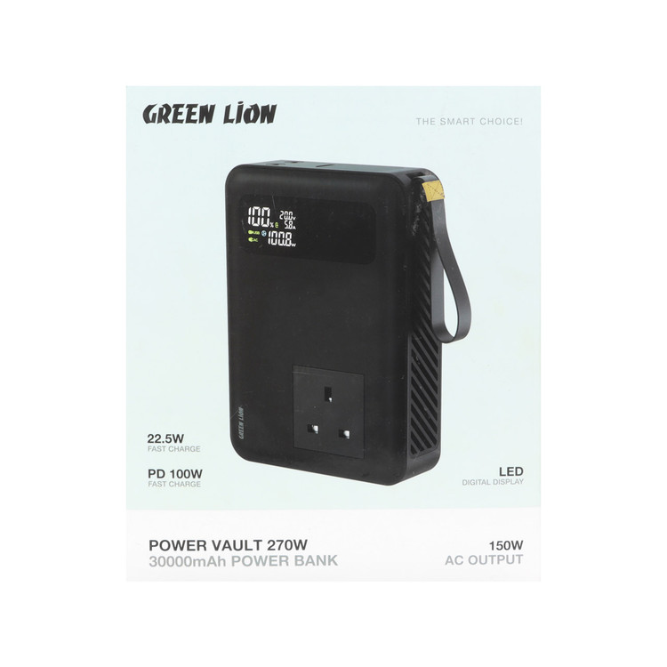 این پاوربانک Green Lion Power Vault 270W 30000mAh است، یک شارژر قابل حمل با ظرفیت بسیار بالا که برای دسترسی کاربران به برق در حال حرکت ساخته شده است. این دستگاه دارای باتری لیتیوم یونی 30000 میلی آمپر ساعتی است و از گزینه های شارژ متعدد مانند خروجی های USB-C و USB-A برای شارژ سریع PD 100 وات و QC 22.5 وات پشتیبانی می کند. این به کاربران امکان می دهد تا طیف گسترده ای از دستگاه ها را شارژ کنند. از نظر خروجی AC 15 وات، همراه با حداکثر خروجی AC + DC آن 270 وات، ایده آل برای استفاده از لپ تاپ ها و سایر وسایل الکترونیکی است. فن خنک کننده داخلی تضمین می کند که هیچ ایمنی در حین کار با قدرت بالا به خطر نیفتد. این پاور بانک قدرتمند دارای یک خروجی USB-A ، دو خروجی USB-C و یک خروجی AC است .