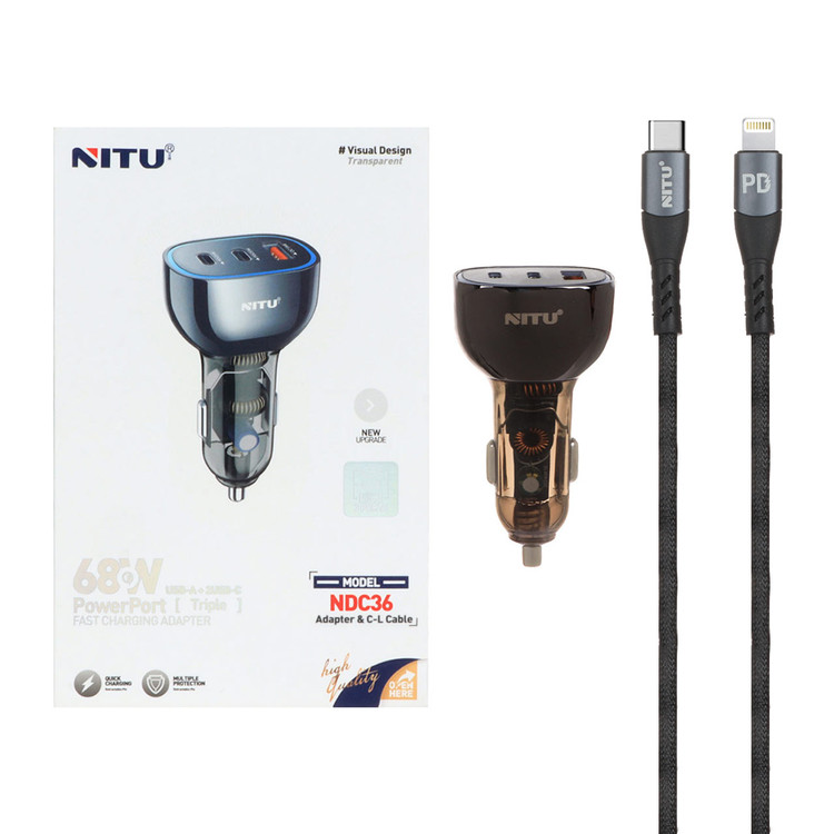 شارژر فندکی فست و PD سه پورت Nitu مدل NDC38 68W به همراه کابل شارژ Type-C To Lightning - مشکی
