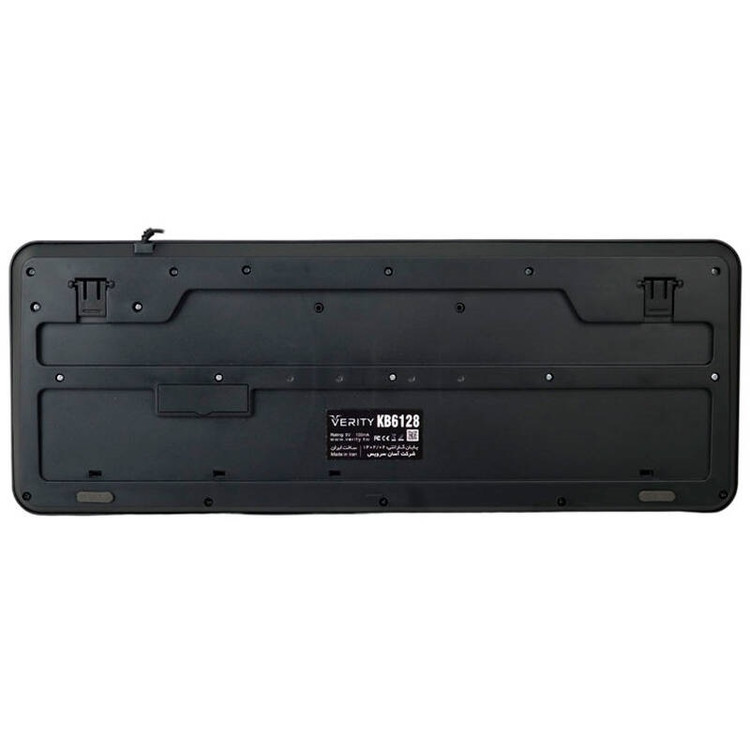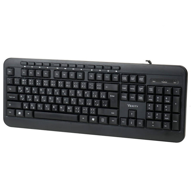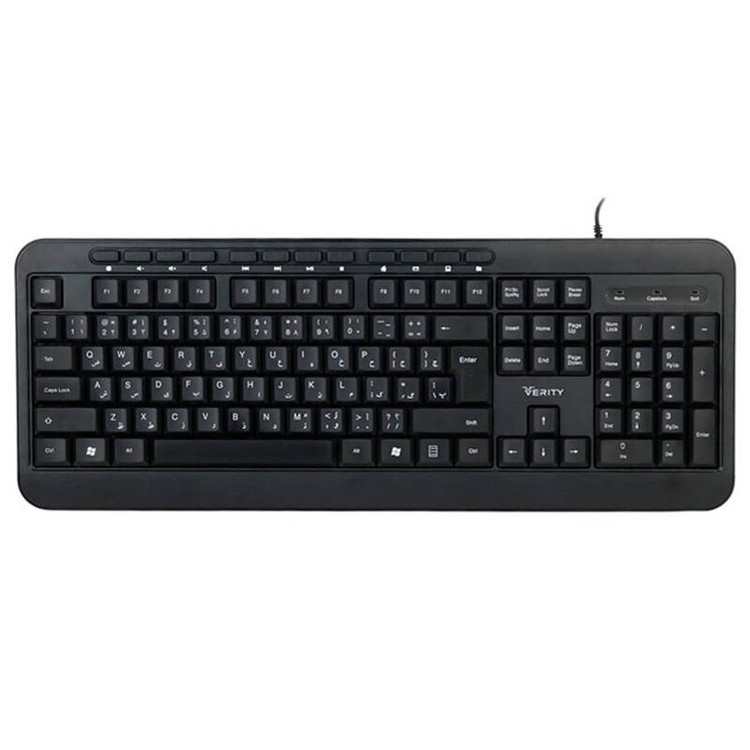 کیبورد Verity V-KB6128 کیبورد با سیم سایلنت وریتی مدل V-KB6128 بدنه ساخته شده از جنس پلاستیک، مقاوم در برابر رطوبت اتصال با سیم از طریق رابط USB، طول کابل 140 سانتی متر طراحی شده به صورت ارگونومیک، دارای پایه کوتاه جهت تنظیم ارتفاع کیبورد دارای 104 عدد کلید با حروف حک شده فارسی، مجهز به کلید های مالتی مدیا بهره مندی از نشانگر LED، میزان ضربه پذیری کلید ها معادل 8 میلیون بار کلیک، عملکرد کم صدا Ultra Silent