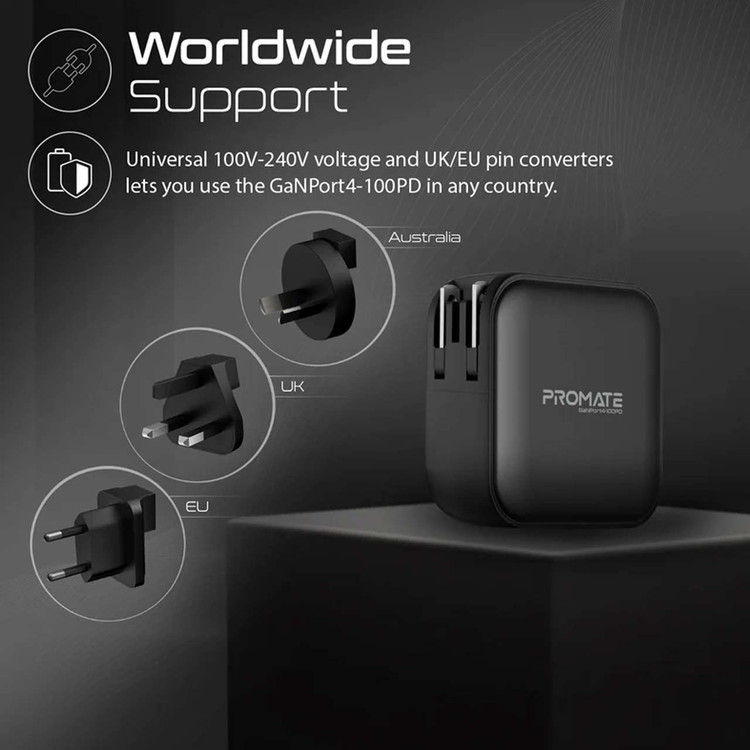 شارژر دیواری فست و PD چهار پورت Promate مدل GaNPort4-100PD.Multi Plug 100W - مشکی