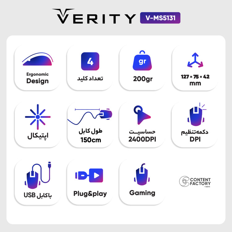 ماوس مخصوص بازی وریتی مدل V-MS5131 یک محصول با کیفیت و قیمت مناسب است که برای علاقهمندان به بازیهای رایانهای طراحی شده است. این ماوس با وزن 200 گرم دارای چهار کلید فیزیکی با میزان ضربهپذیری سه میلیون بار کلیک است که به شما امکان میدهد به راحتی بازیهای مورد علاقه خود را کنترل کنید. همچنین، این ماوس دارای یک کلید DPI است که به شما اجازه میدهد تا دقت حسگر اپتیکال آن را بین 800 تا 1600 تنظیم کنید. با این کار، شما میتوانید بهترین تجربه بازی را برای خود انتخاب کنید. این ماوس با اکثر سیستمهای عامل و بازیهای موجود سازگار است و نیازی به نصب هیچگونه نرمافزاری ندارد. فقط کافیاست کابل USB این ماوس را به رایانه خود متصل کرده و لذت بازی را بچشید. اگر بهدنبال یک ماوس گیمینگ با کیفیت و ارزانقیمت هستید، ماوس مخصوص بازی وریتی مدل V-MS5131 را از دست ندهید. ماوس بازی وریتی طراحی ارگونومیک و زیبایی دارد که باعث میشود دست شما در طول کار با ماوس، راحت و آسوده باشد. بدنه این ماوس از جنس پلاستیک با کیفیت بالا ساخته شده است که مقاوم در برابر خط و خش و لغزش است. روکش کابل این وسیله، از جنس الیاف بافته شده است که مقاوم در برابر کشش، خمیدگی و پارگی است. ماوس مذکور، همچنین دارای یک نورپردازی RGB جذاب است که با تغییر رنگ، بازیهای شما را زیباتر و جذابتر میکند.