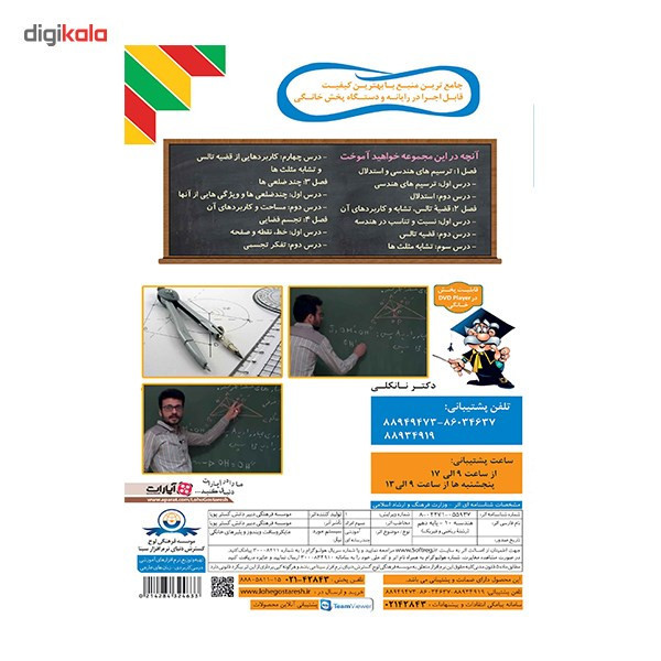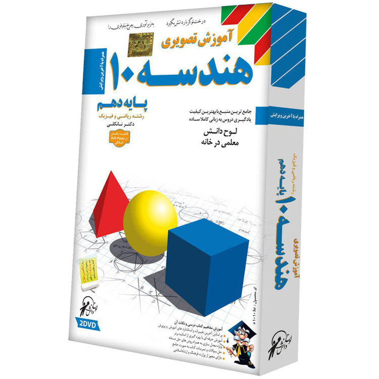 - حاوی دو حلقه دیویدی قابل پخش در دیویدی پلیرهای خانگی و رایانهها با سیستم عامل ویندوز - حاوی آموزشهای درس هندسه برای دانشآموزان پایه دهم رشته ریاضی و فیزیک - ارائهی آموزشها براساس آخرین تغییرات و استانداردهای آموزش و پرورش