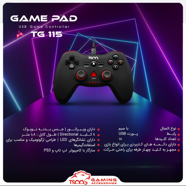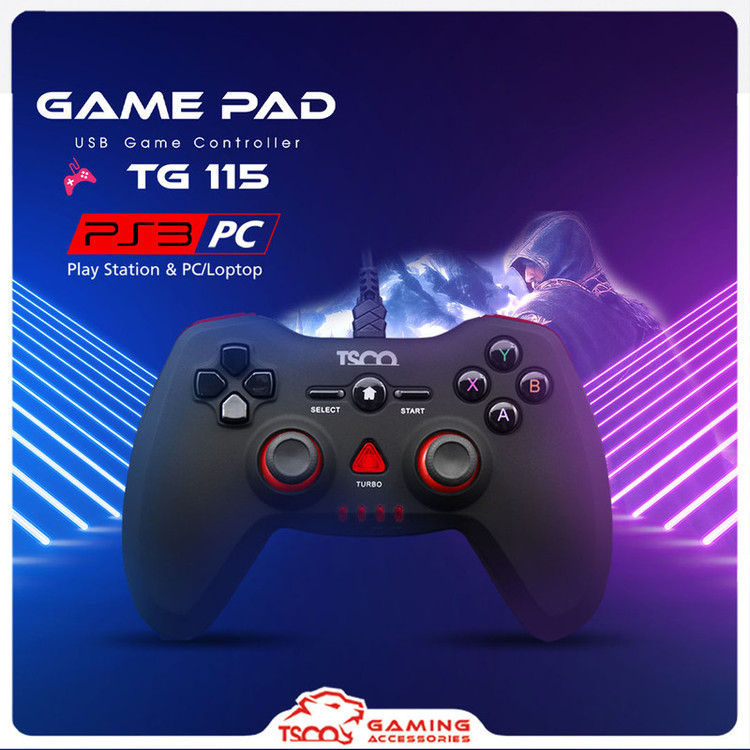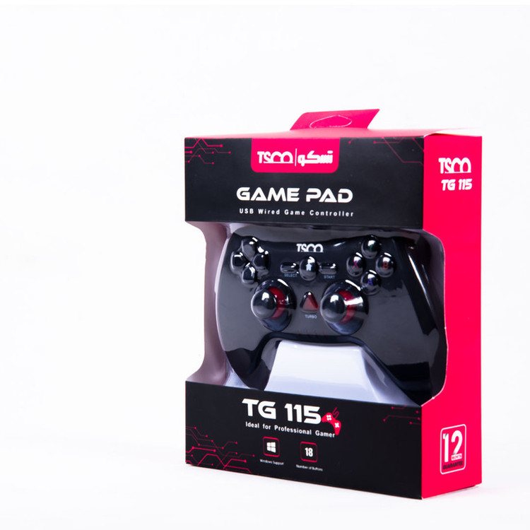 دستهي بازي TSCO مدل «TG 115» وسيلهي جانبي کنسول PS3 است که با ويندوز هم سازگاري دارد؛ يعني ميتوانيد با اين دسته به بازي با کامپيوتر و پلياستيشن 3 بپردازيد. به لطف ویبراتوري که در اين دسته تعبيه شده است، گيمرها در لحظات حساس بازي، هيجان زيادي را تجربه ميکنند. مجموع کليدهاي روي دسته و بالاي آن بدون درنظرگرفتن آنالوگ استيکها 16 عدد است. اين مدل باسيم به واسطهي يک کابل USB به به طول 1.8 متر به کامپيوتر شما متصل ميشود.